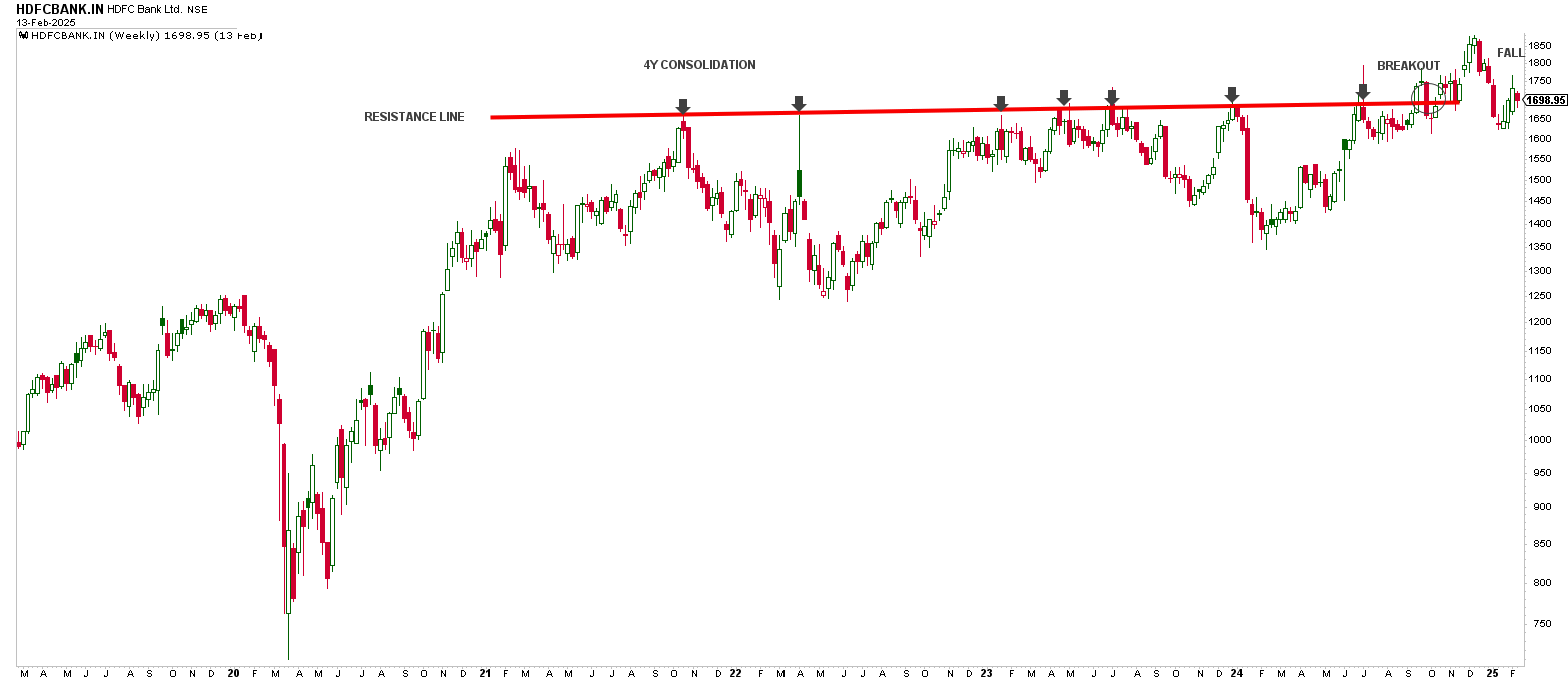 - Traditional TA identifies resistance by simply connecting peak points, suggesting a breakout after 4 years of consolidation. Shortly after this breakout, the price falls back again, resulting in a misleading signal.